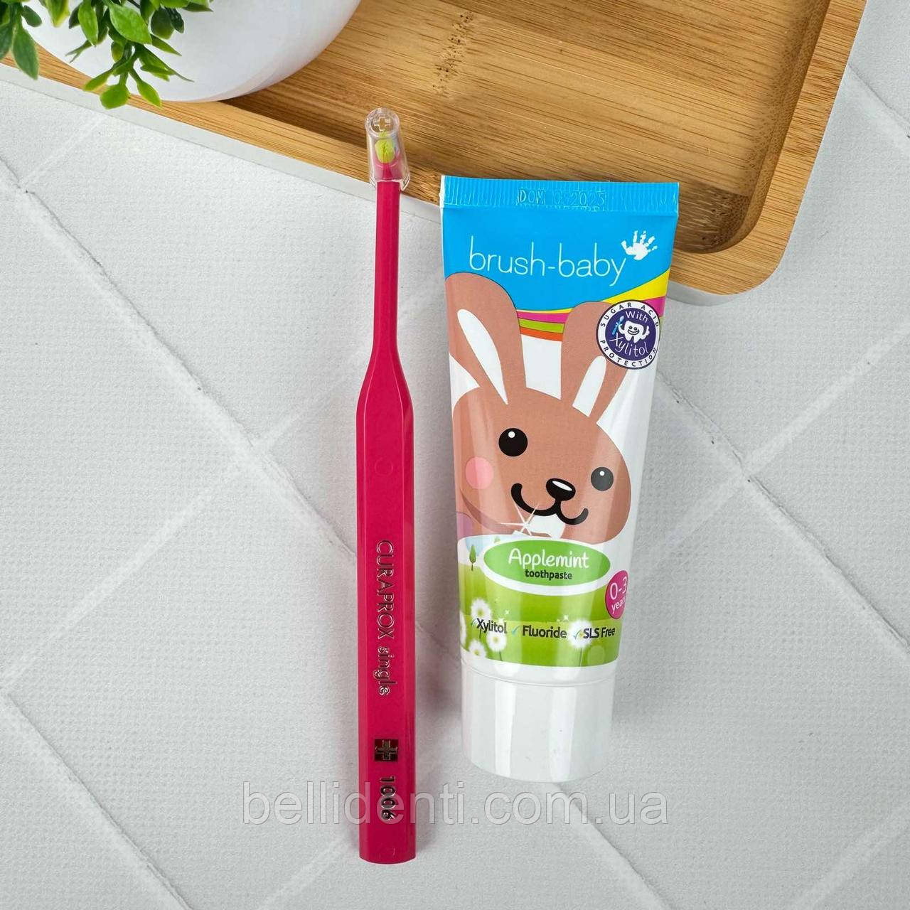 Набір для перших зубів від 0 до 3 років (зубна паста Brush-Baby зайчик, 50 мл+монопучкова щітка Curaprox 1006), темно-рожевий